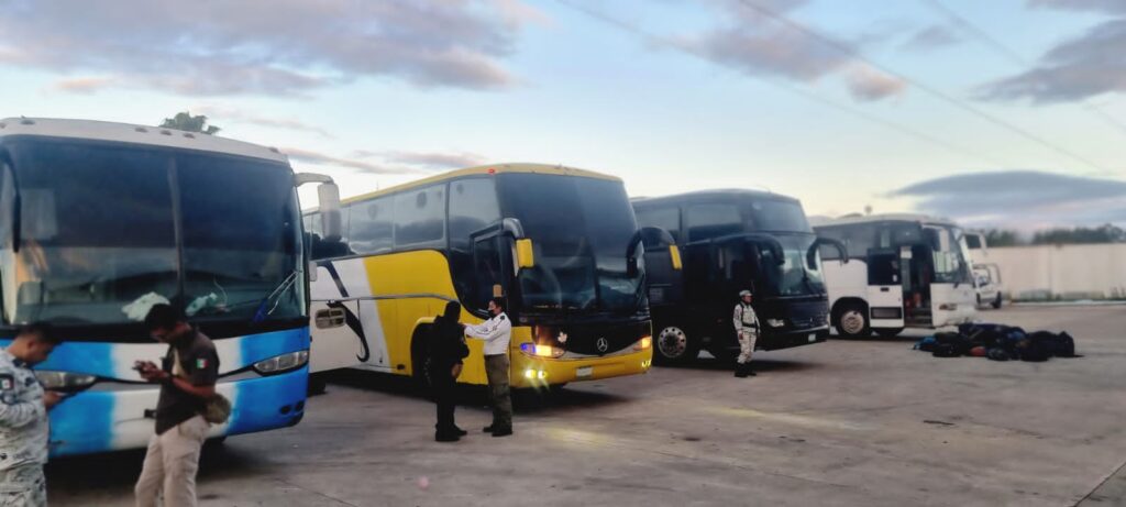 La madrugada de hoy Agentes Federales del INM realizaban acciones de verificación en el punto ubicado en Nuevo Teapa, municipio de Moloacán, y se le marcó el alto a cuatro autobuses para realizar la labor de rutina con pleno respeto a los derechos humanos de los pasajeros.