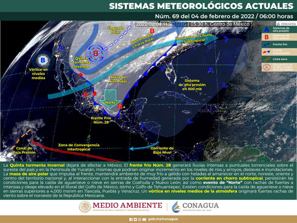 De acuerdo con el comunicado del organismo dependiente de la Comisión Nacional del Agua (Conagua), el frente frío se extenderá sobre la Península de Yucatán y el sureste mexicano, ocasionando lluvias muy fuertes a intensas en dichas regiones, con lluvias puntuales torrenciales en zonas de Chiapas y Tabasco
