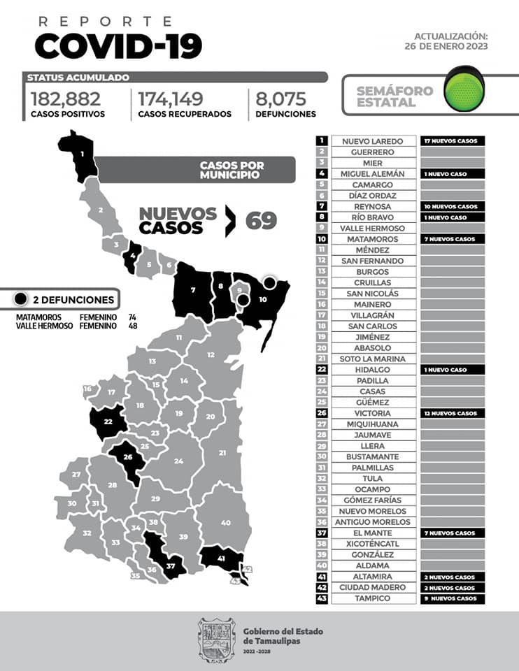 Un total de 69 nuevos pacientes y 2 fallecimientos por Covid-19 en Matamoros