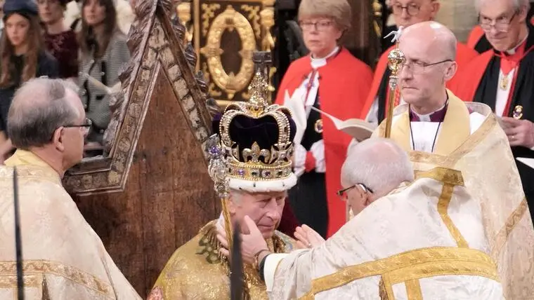 Fue el arzobispo de Canterbury, Justin Welby, quien se encargó de clocar sobre la cabeza de Carlos III la suntuosa corona de San Eduardo, del siglo XVII, posteriormente al colocarle la corona Justin Welby gritó a la congregación “Dios salve al Rey”.