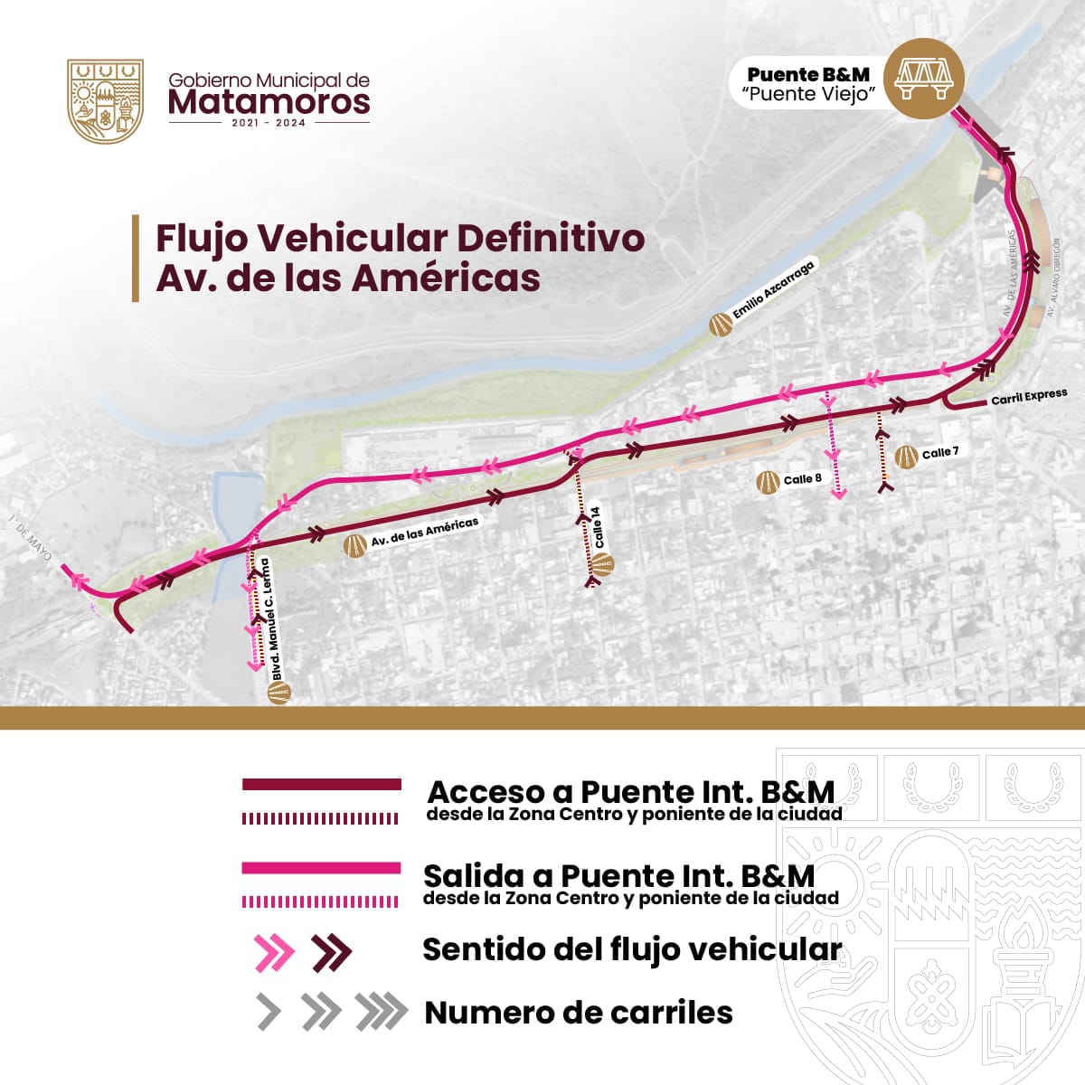 Los trabajos también incluyen la apertura de un carril de norte a sur, facilitando el acceso de vehículos de Brownsville a Matamoros, desde la Aduana, hasta la calle Galeana sobre la Avenida de las Américas, dando acceso a la zona centro por la calle 8, y hacia el poniente de la ciudad por la calle Galeana.