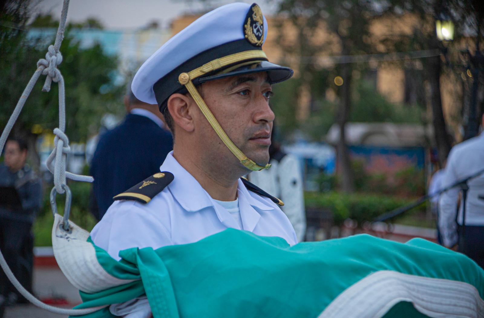 El izamiento de bandera estuvo a cargo de elementos de la Primera Zona Naval, en tanto que el escudo de Tamaulipas fue portado por la escolta de la Secundaria Técnica Número 46, institución que también participó con su banda de guerra.