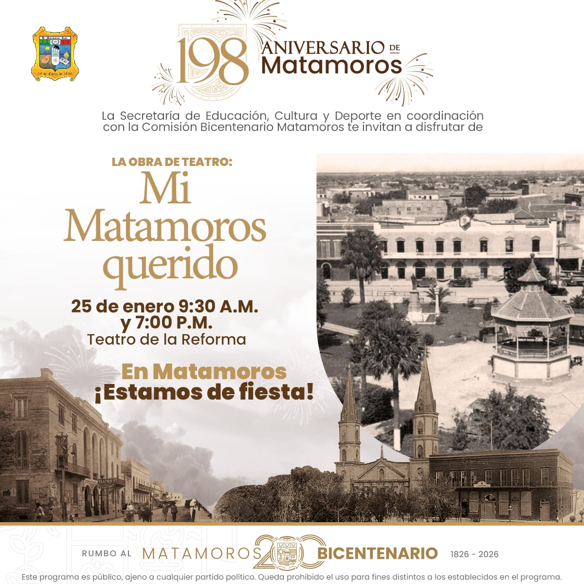 El Municipio de Matamoros a través de la Secretaría de Educación, Cultura y Deporte, en coordinación con la Comisión Bicentenario invitan a la presentación de la obra “Mi Matamoros querido”, hoy a las 19:00 Hrs. en el Teatro de la Reforma LOCAL 25 enero, 20249 febrero, 2024César Peralta