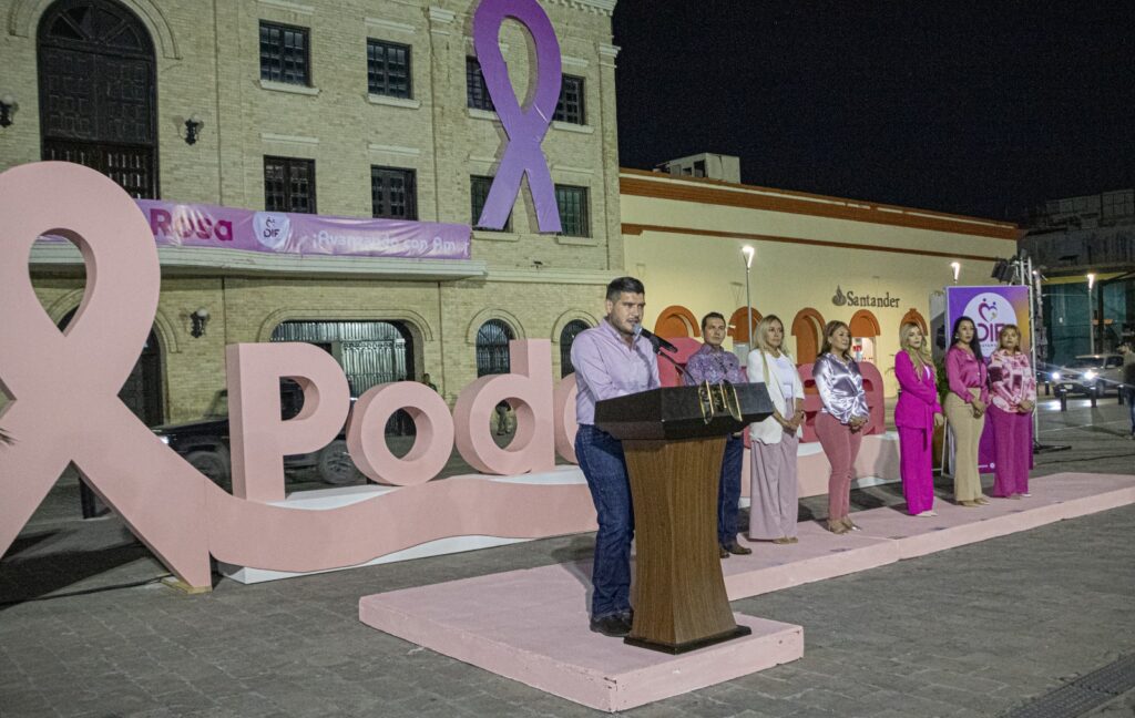 El alcalde Alberto Granados, acompañado por la presidenta del Sistema DIF Matamoros, Anabeth Ariceaga, encabezó el evento “Iluminación #SoyPodeRosa”, cuyo objetivo es sensibilizar a la población sobre la importancia de la prevención y detección temprana de esta enfermedad.
