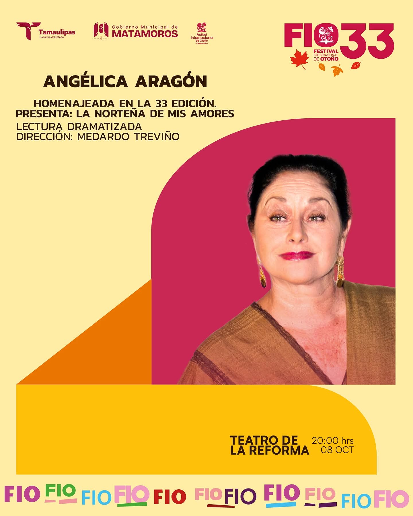 El Gobierno de Beto Granados informó que la reconocida actriz Angélica Aragón será homenajeada en la 33ª edición del Festival Internacional de Otoño, un evento que exalta el arte y consolida a Matamoros como un referente cultural en la región. Este homenaje forma parte de las actividades impulsadas para fortalecer la identidad artística de la ciudad.